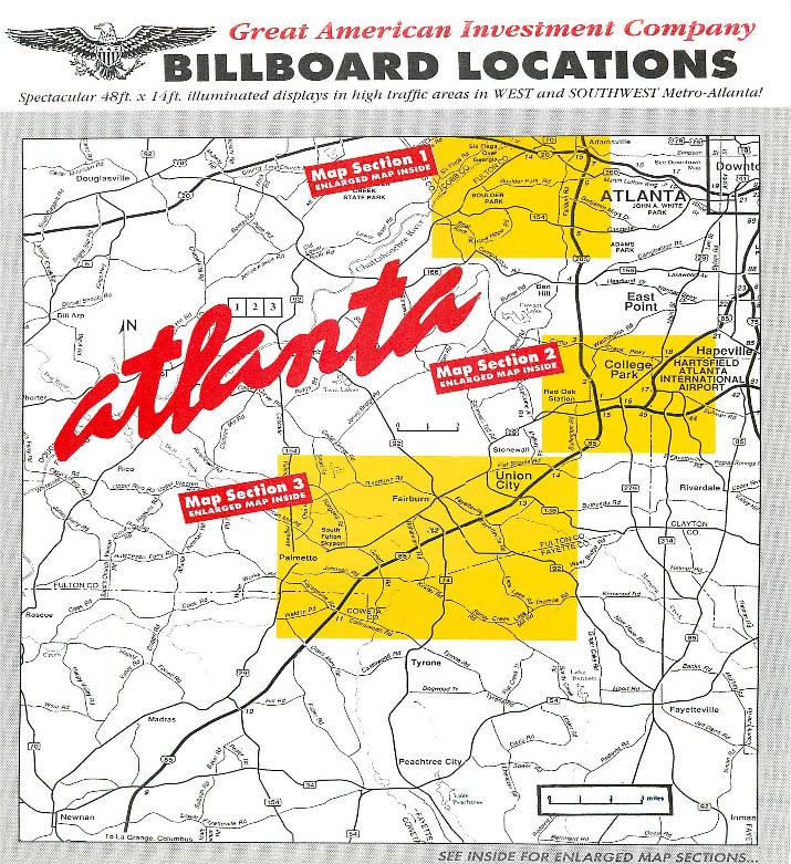We have # billboard faces across the south Atlanta area. Here is a list of our structures and their locations *Faces subject to availability, call (404) 557-9271 to find out whats currently available in your area.